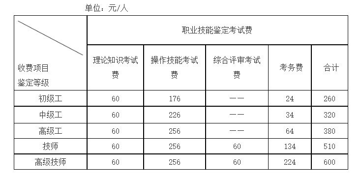 我院职业技能等级认定收费标准如下: